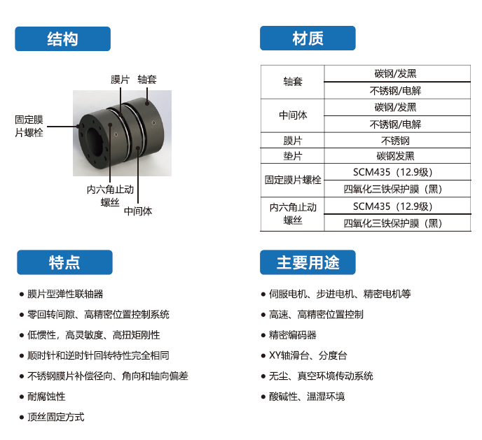 SFPS-G系列聯軸器采用碳鋼發黑,利用脹緊套聯接的膜片型彈性聯軸器,廣泛用于伺服電機、步進電機、精密電機等。