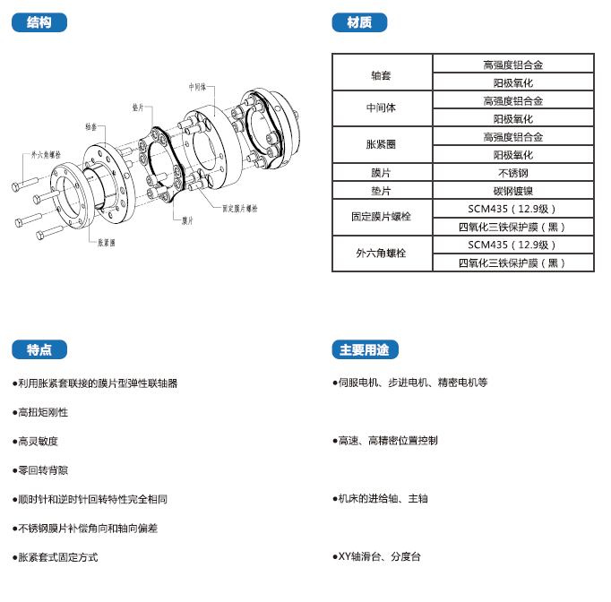 SFP-T系列聯軸器采用高強度鋁合金材料,經過陽極氧化處理,廣泛用于伺服電機、步進電機、精密電機等。