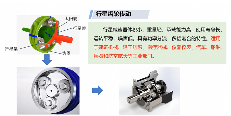 行星減速機,其包括:行星輪、太陽輪和外齒圈。行星減速器體積小、重量輕,承載能力高,使用壽命長、運轉平穩,噪聲低。具有功率分流、多齒嚙合的特性。適用于建筑機械、輕工紡織、醫療器械、儀器儀表、汽車、船舶和航空航天等領域。