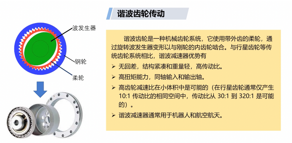 諧波減速機,其通過具有柔性的薄壁外齒齒輪產生彈性變形后與剛性的內齒輪進行內嚙合來實現傳動的。它由剛輪、柔輪,波發生器三大傳動元件組成。諧波減速機傳動比大,無回差,結構緊湊和重量輕,高精度等優點在機器人及自動化技術領域發揮舉足輕重的作用,我國自1980年開始進行諧波減速器標準化和系列化;1985年制定了中小功率通用諧波減速器系列標準,成為世界第四個擁有通用諧波減速標準的國家。