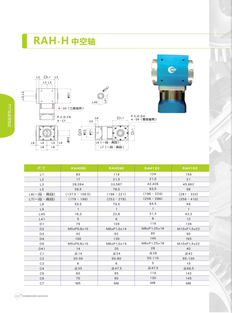RAH-H系列是中空軸設計。 鋁合金材質可提高散熱能力,減緩溫升現象造成影響。 多樣化的出力軸可因應各種場合,客制化的入力端可搭配各式馬達。 提供各式特色之減速機,供使用者依需求選購。 特殊油封設計,正常使用下不需保養亦不用更換潤滑油,可延長使用壽命。 各式特色,體積小,省空間,噪音低,輸出扭矩高,安裝容易,可搭配馬達型號廣泛。 RAH搭配DM,一體成型的齒輪組,可有效的減低噪音。 RAH搭配DH,最佳的性價比,可廣泛應用于各種場合。