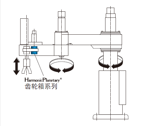 水平多關節工業機器人,包括底座,底座上設置有下臂,下臂上設置有上臂,上臂的右側設置有驅動電機、主動帶輪、從動帶輪、花鍵軸、諧波減速機以及傳動軸,驅動電機豎直設置在主動帶輪的上方,主動帶輪在驅動電機的驅動下進行轉動,從動帶輪設置在主動帶輪的右側并通過同步帶與主動帶輪同步轉動,從動帶輪的中心豎直設置有傳動軸,傳動軸貫穿從動帶輪且向下延伸形成延伸部,諧波減速機設置在傳動軸的延伸部上,傳動軸的中心設置有花鍵軸,花鍵軸貫穿諧波減速機并向外延伸,諧波減速機通過花鍵母與傳動軸固定連接。